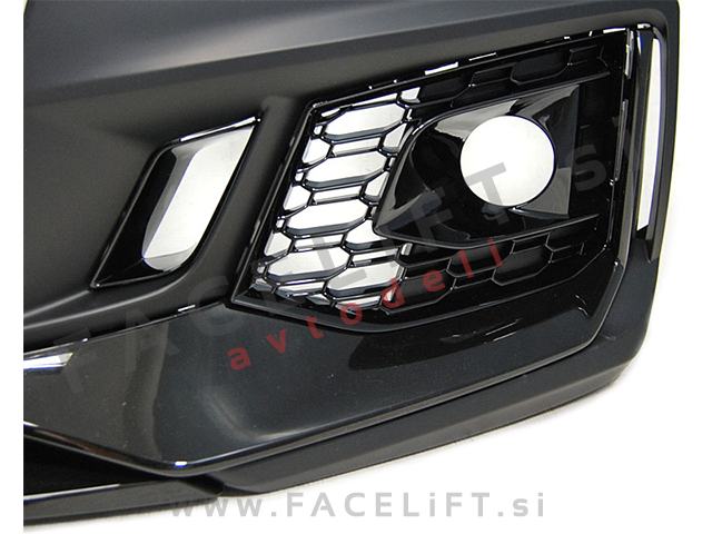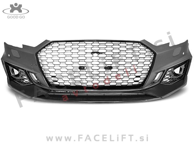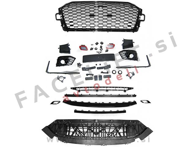 Sprednji odbijač RS4 izgled. V kompletu prejmete sprednji odbijač, mreže, masko, podaljšek odbijača in ostalo kar je prikazano na sliki in potrebno za montažo. Odbijač je nov in pripravljen za barvanje (v primerju).