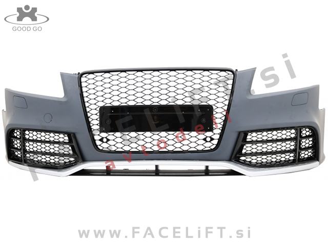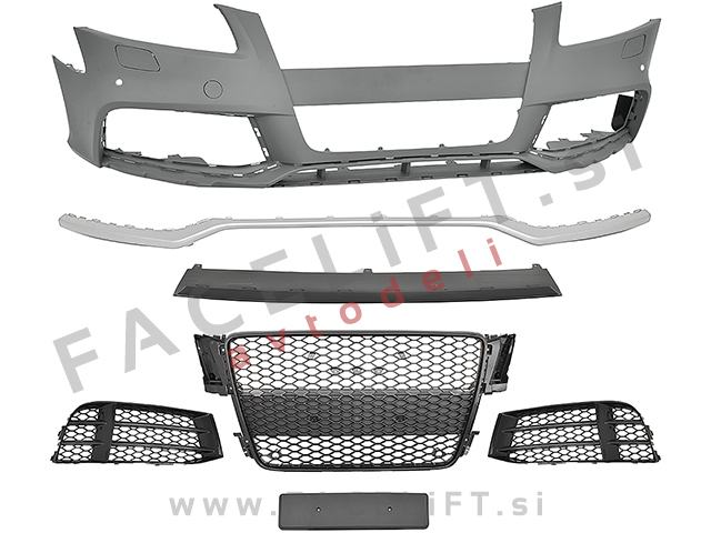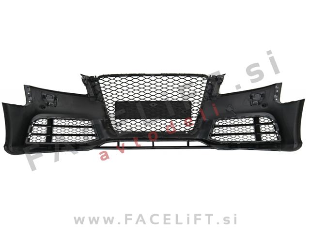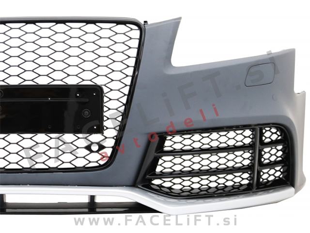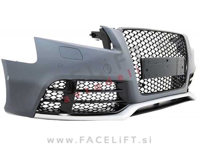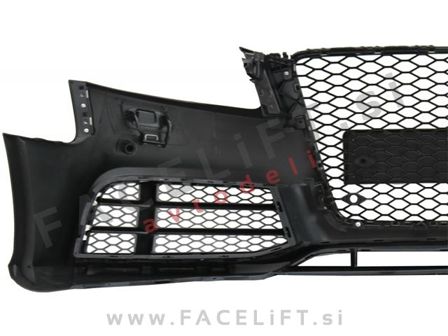 Sprednji odbijač RS5 izgled. V kompletu prejmete sprednji odbijač, mreže, masko, upore CANBUS, za preprečitev napake na računalniku zaradi meglenk in čepe za PDC senzorje. Odbijač je nov in pripravljen za barvanje (v primerju).