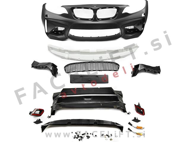 Sprednji odbijač M2 izgled. V kompletu prejmete sprednji odbijač, mreže in ostalo kar je prikazano na sliki in potrebno za montažo. Odbijač je nov in pripravljen za barvanje (v primerju).