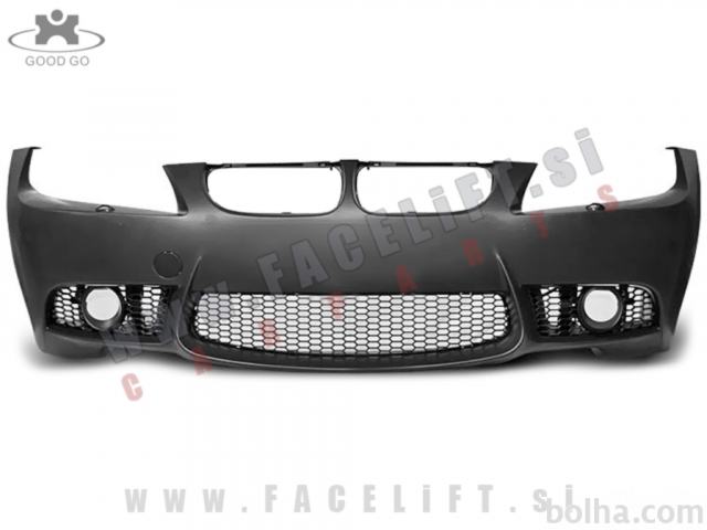 Sprednji odbijač M3 izgled. V kompletu prejmete sprednji odbijač, pokrov vlečne kljuke, pokrove sistema za pranje žarometov SRA, levo, desno in srednjo mrežo. Odbijač je nov in pripravljen za barvanje (v primerju).