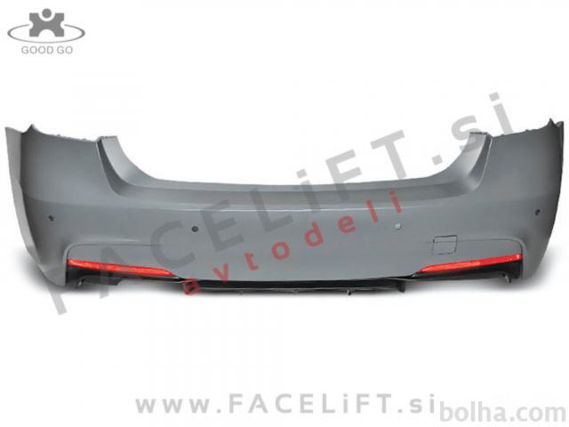 Zadnji odbijač M-Performance. V kompletu prejmete zadnji odbijač z odprtinami za parkirne senzorje PDC, pokrov vlečne kljuke, difuzor z levim izpuhom. Odbijač je nov in pripravljen za barvanje (v primerju).