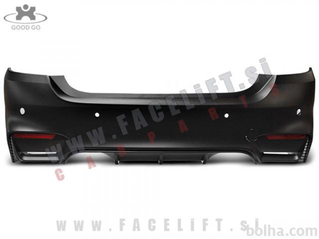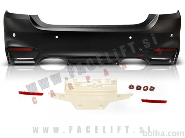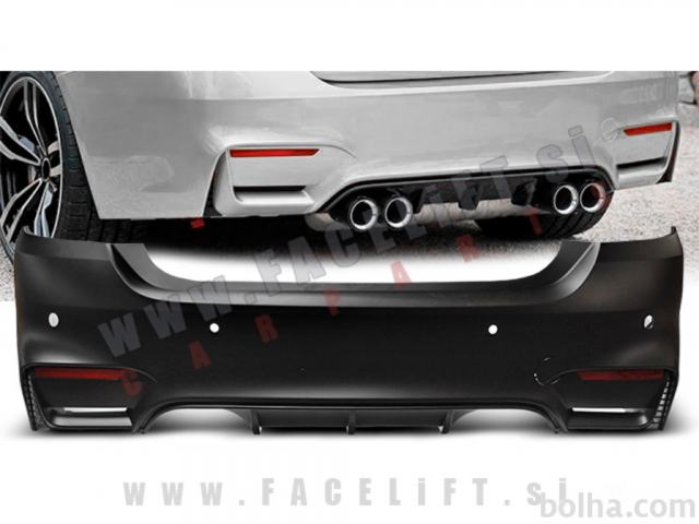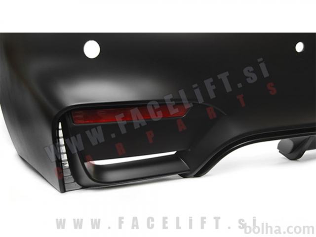 Zadnji odbijač M4 izgled. V kompletu prejmete zadnji odbijač z difuzorjem za dvojni izpuh (Duplex), pokrov vlečne kljuke, nosilce parkirnih senzorjev PDC in spodnjo ojačitev. Odbijač je nov in pripravljen za barvanje (v primerju).