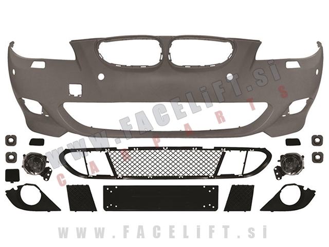 Sprednji odbijač. V kompletu prejmete odbijač, mrežice meglenk, srednjo mrežo, pokrovček vlečne kljuke, pokrovčke sistema za pranje žarometov SRA, nosilec registrske tablice in meglenke. Odbijač je nov in pripravljen za barvanje (v primerju).