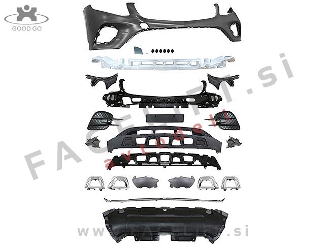 Sprednji odbijač AMG izgled. V kompletu prejmete sprednji odbijač, levo mrežo, desno mrežo in ostalo kar je prikazano na sliki in potrebno za montažo. Odbijač je nov in pripravljen za barvanje (v primerju).