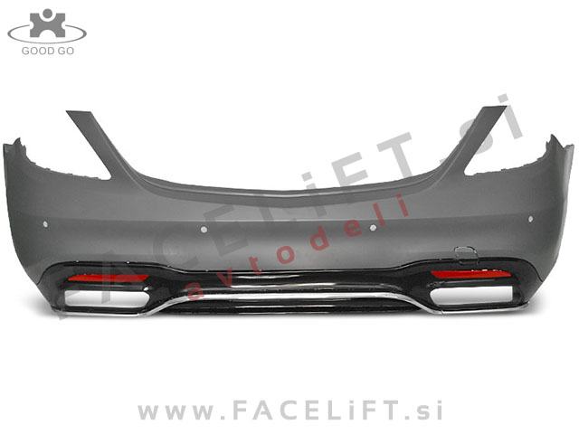 Zadnji odbijač AMG S63 izgled. V kompletu prejmete zadnji odbijač, pokrov vlečne kljuke, difuzor z dvema dvojnima odprtinama za izpušni sistem in ostalo, kar je prikazano na sliki. Odbijač je nov in pripravljen za barvanje (v primerju).