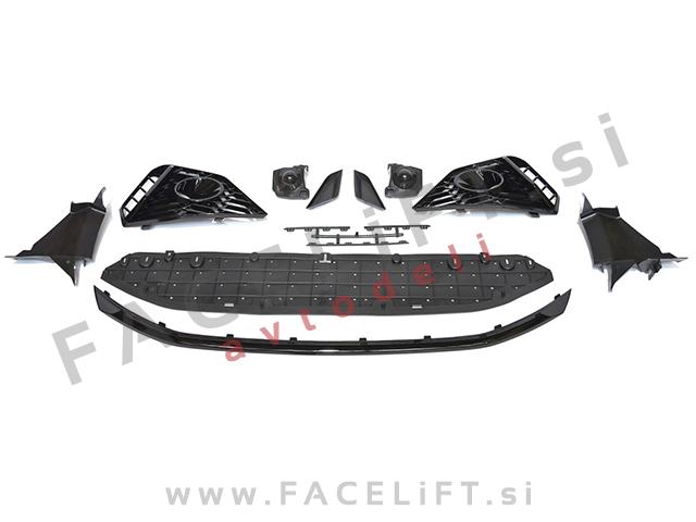Sprednji odbijač. V kompletu prejmete sprednji odbijač, levo mrežo, desno mrežo, masko, pokrov vlečne, pokrove sistema za pranje žarometov SRA in ostalo kar je prikazano na sliki in potrebno za montažo. Odbijač je nov in pripravljen za barvanje (v primerju).