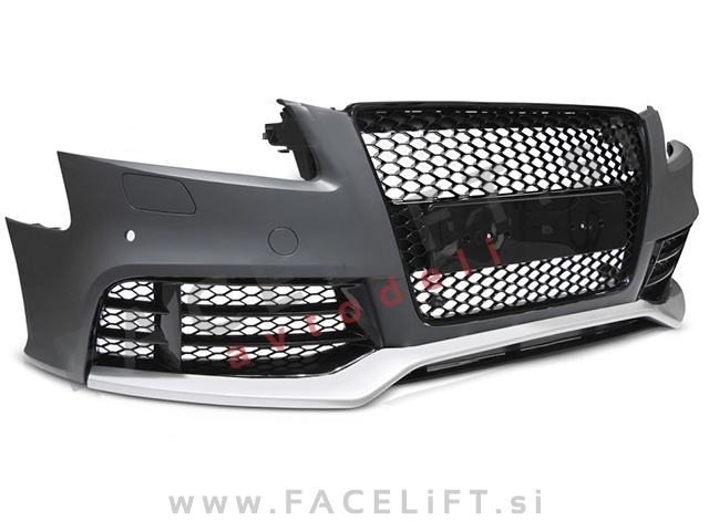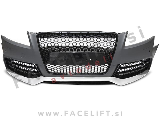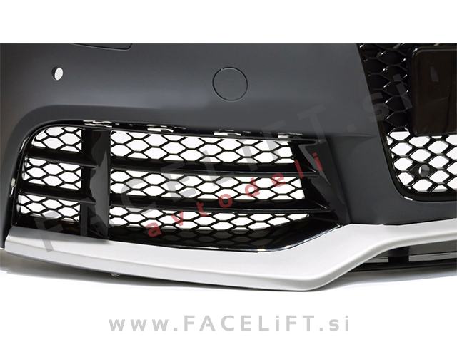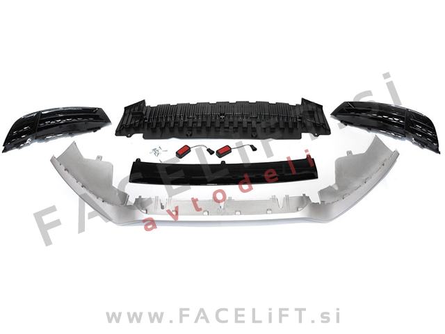 Sprednji odbijač. V kompletu prejmete sprednji odbijač, levo mrežo, desno mrežo, masko, pokrov vlečne, pokrove sistema za pranje žarometov SRA, podaljšek sprednjega odbijača in ostalo kar je prikazano na sliki in potrebno za montažo. Odbijač je nov in pripravljen za barvanje (v primerju).