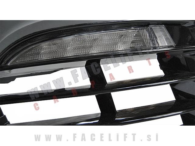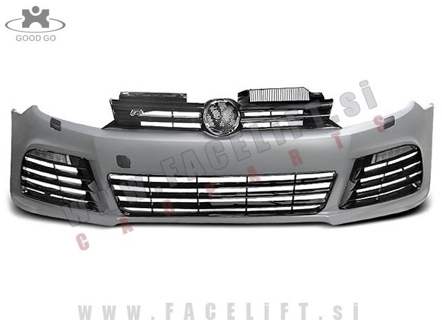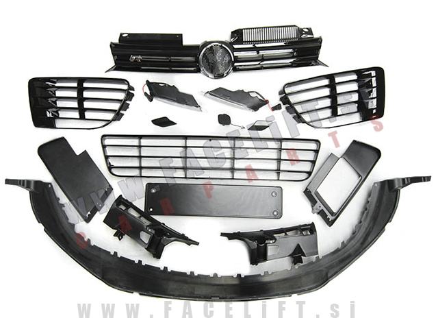 Sprednji odbijač R20 izgled. V kompletu prejmete sprednji odbijač, pokrov vlečne kljuke, pokrove sistema za pranje žarometov SRA, mrežice odbijača, masko, LED dnevne luči in ostalo, kar je prikazano na sliki. Odbijač je nov in pripravljen za barvanje (v primerju).