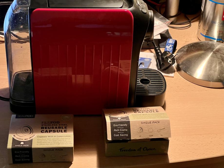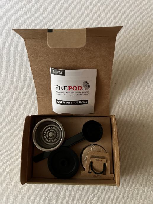 Prodam nerabljeno kapsulo SealPod FeePod iz nerjavečega jekla s silikonskim pokrovčkom. Kapsula je namenjena pripravi mlete kave po lastni izbiri (če imate mlinček, si lahko zmeljete tudi svežo kavo v zrnih) in vas tako ne omejuje na nakup Tchibo kapsul. Kapsula je združljiva in preizkušena z aparatom Tchibo Cafissimo easy. Kompletu je priložena merica za doziranje kave, papirnati filtri (uporabite po želji) in dodaten silikonski obroček. Silikonski pokrovček omogoča boljšo kompatibilnost z aparatom, v primerjavi s kovinskim pokrovčkom, pa se izognete nevarnosti, da bi poškodovali mehanizem kavnega aparata. Prodajam, ker sem pred časom vzel dodatno kapsulo, potem pa ugotovil, da mi ena količinsko popolnoma zadostuje.