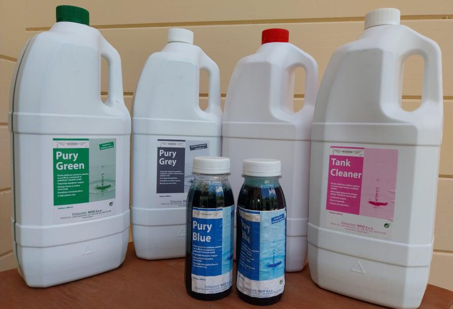 PURY GREY: preprečuje širjenje neprijetnega vonja po gnilobi iz vašega tanka za odpadno vodo v 2 literski plastenki.