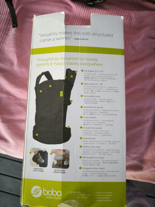 Prodam dobro ohranjeno nosilko za dojenčka. V žepu zgoraj je skrita senčka ki ščiti pred soncem. Boba je moderna nosilka, s katero bodo sprehodi z dojenčkom vedno prijetni in moderni.