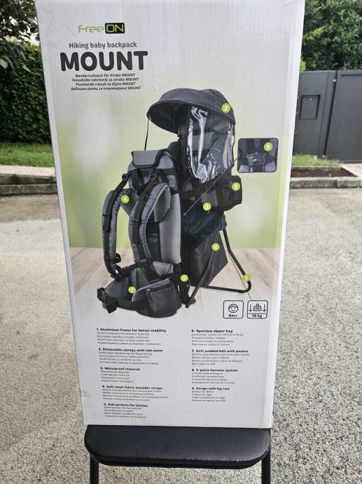 Nahrbtnik s preprostim sistemom zlaganja, aluminijastim stojalom in izredno stabilnostjo, odstranljivo strehico z dežno zaščito, izdelan iz vodoodpornega materiala 600D oxford in z mehkimi naramnicami zagotavlja udobje otroku in staršu tudi med dolgimi pohodi. 2 stranska žepa, prostorna torba pod sedežnim delom, stranski žep na pasu, 5-točkovni sistem zapenjanja, pomanjševalec, trakovi z oporo za noge in nastavljive ramenske ter stranske trakove za popolno prilagoditev in zagotovitev stabilnosti in varnosti med nošenjem.