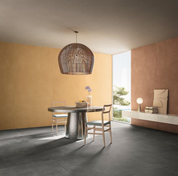 V rumeni barvi, videz betona, dimenzije 60x120 cm, rektificirani robovi.