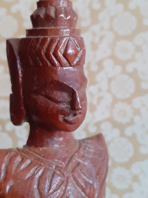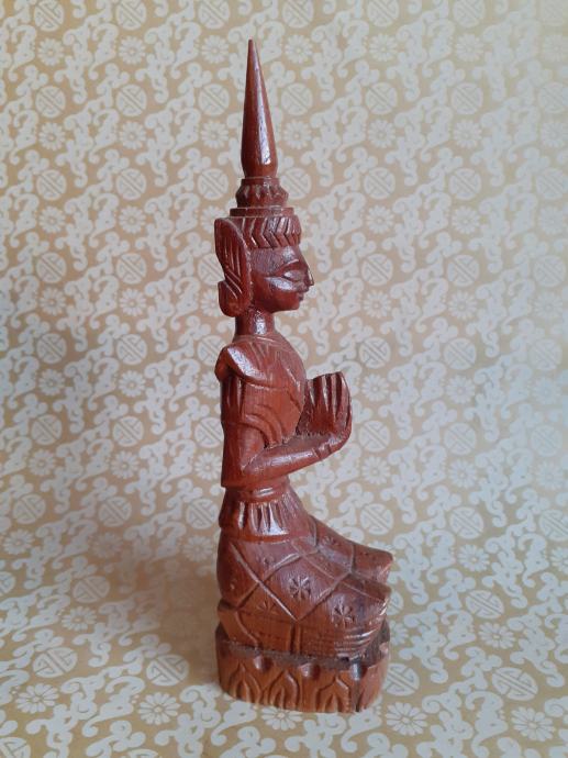 Starinska figura Tajskega Bude, ki je izrezljana iz lesa, kleči in moli. Višina 20 cm. Iz 70-ih let 20. st.