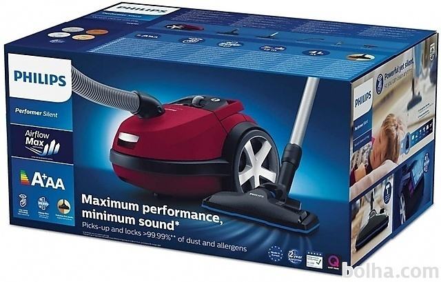 Opis:Dom je s čistimi tlemi bolj zdrav. Novi sesalnik Philips Performer Silent se ponaša s tehnologijo nastavkov za temeljito odstranjevanje umazanije in finih prašnih delcev in s tem zagotavlja zdravo okolico. S samo 66 dB je hkrati tudi naš najtišji sesalnik do zdaj.Visoka učinkovitost pri nizki porabi energijeTa sesalnik zagotavlja visoko zmogljivost in nizko porabo energije. Izdelek spada v razred energijske učinkovitosti A+ na energijski oznaki EU.Kadarkoli neslišno sesajte, ne da bi pri tem koga motiliTa sesalnik je zasnovan za tiho delovanje, da lahko sesate kadar koli, ne da bi pri tem motili svoje domače. Izdelek sestavljajo prilagojeni zračni kanali, odbijači in tih motor, da lahko uživate v tihem sesanju. Izdelek ima certifikat Quiet Mark.Protialergijski filter zajame 99,9 % prahu – s certifikatom ECARFNaš filtrirni sistem za čisti zrak zajame 99,9 % drobnega prahu, vključno s cvetnim prahom, dlakami hišnih ljubljenčkov in pršicami. To je odlično za vse, ki imajo težave z alergijami, ali tiste, ki si želijo vrhunske higiene. S potrdilom ECARF za protialergijsko delovanje.Nastavek TriActive Pro odstrani najmanjše prašne delce za temeljitejšo čistočoNovi nastavek TriActive Pro je vrhunski Philipsov nastavek za globinsko čiščenje preprog in trdih tal. Nastavek se odlično oprime tal in seže globoko v preproge, da odstrani tudi najmanjše prašne delce.Nastavek za parket tla ščiti pred praskamiMehke ščetine nastavka za parket nežno očistijo trda tla in jih ščitijo pred praskami.Z dolgim, 12-metrskim dosegom lahko posesate večjo površino brez izklapljanja kablaDoseg sesalnika od vtiča do nastavka meri 12 metrov, zato lahko čistite dlje brez izklapljanja kabla.V ročaj je vgrajena mehka krtača, ki je vedno pripravljena na uporaboNastavek s ščetko za čiščenje je vgrajen v ročaj in je tako vedno pri roki za čiščenje pohištva, ravnih in tekstilnih površin.Preproste vrečke s-bag lahko uporabljate do 50 % dlje časaVrečke s-bag lahko uporabljate do 50 % dlje časa in ohranjajo popolno moč sesanja sesalnika, dokler niso napolnjene. Primerne so za vse modele sesalnikov in imajo tesnilni mehanizem za čisto odstranjevanje.Z veliko 4-litrsko prostornino boste vrečko menjali manj pogostejeKomora za prah z veliko prostornino sprejme štiri litre prahu, preden morate vrečko zamenjati.Izdelano v Evropi; kakovost, ki ji lahko zaupateTa izdelek je zasnovan, preskušen in izdelan v Evropi, kar pomeni najvišjo raven kakovosti.Lastnosti: Barva: Rdeča Območje delovanja: 12 m Ročaj za prenašanje: Zgoraj in spredaj Dolžina kabla: 9 m Indikator polne komore za prah Vrsta cevi: Kovinska 2-delna teleskopska cev Vrsta kolesc: Gumijasta Cevni spoj: SmartLock Regulator moči: Elektronski, na aparatuNastavki in krtače: Ozki nastavek Mali nastavek Vgrajena krtača Nastavek za parket TriActive ProFiltriranje: Vrsta vrečke za prah: Vrečka s-bag z izjemno dolgo živ. dobo Zmogljivost za prah: 4 L Izhodni filter: Protialergijski filter Filter motorja: MikrofilterTehnični podatki: Ocena energijske učinkovitosti: A+ Razred izpusta prahu: A Razred čiščenja preprog: B Razred čiščenja trdih tal: A Vhodna moč (IEC): 650 W Glasnost: 66 dBTeža in dimenzije: Dimenzije izdelka (D x Š x V): 470 x 320 x 280 mm Teža izdelka: 5,4 kg Več podatkov si oglejte na tej povezavi...