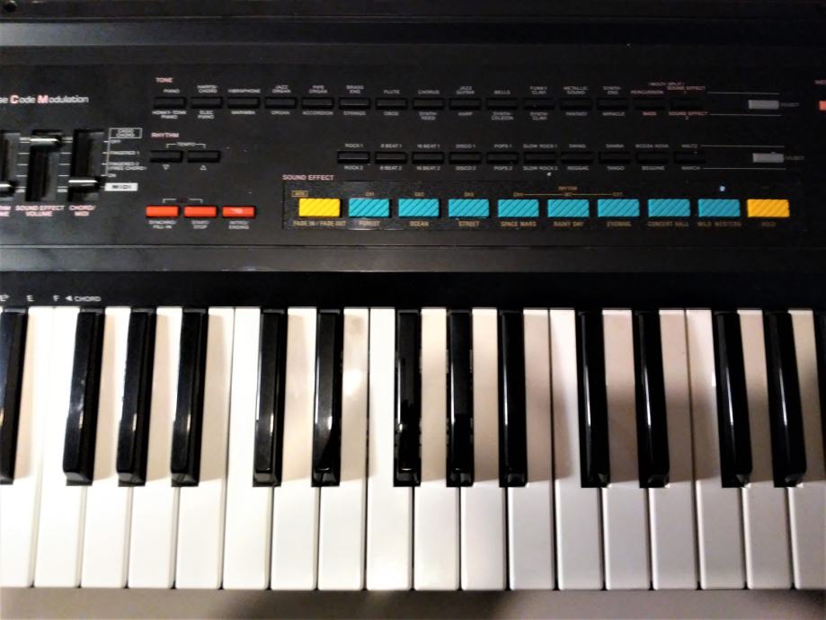Klaviatura (5 oktav, klavirska velikost tipk) je dobro ohranjena. Ima 465 kombinacij odličnih zvokov (dodani je tudi 8 zanimivih zvočnih efektov-dodatne tipke za efekte.)ter dobre ritme in dobro avtomatsko spremljavo. Regulacija glasnosti je posebej za ritem,posebej za spremljavo, posebej za zvočne efekte ter posebej skupna glasnost (4 regulatorji glasnosti)