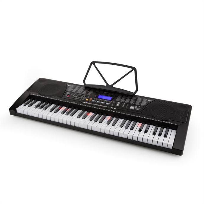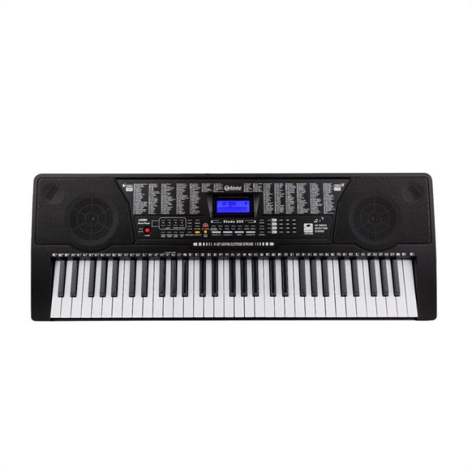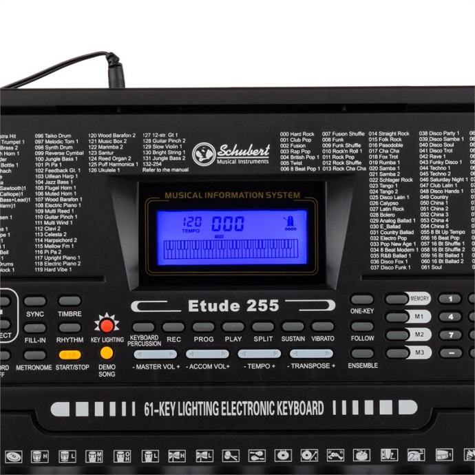 Elektronska klaviatura za začetnike: 61 osvetljenih tipk z dinamiko udarca, 255 glasov, 255 pesmi za spremljavo in 50 demo pesmi.AUX vhod, vhod za slušalke in mikrofon, funkcija snemanja in playback.Inteligentna funkcija za vajo s 3 načini učenja, osvetljene tipke in postopno učenje ritma in melodije.61 osvetljenih tipk z dinamiko udarca vabi klavir Schubert Etude 225 USB na pot do magičnega sveta tonov in vzpodbuja začetnike, da se naučijo zaigrati nove melodije oz. povadijo tiste, ki jih že znajo.255 glasov, 255 ritmov, 50 demo pesmi in začetna sekcija z tolkali omogočajo začetnikom razviti svojo kreativnost do maksimuma. Pitch bend kolesce in ostali učinki (sustain ali vibrato) razširjajo performativni značaj tipk.Poleg klasičnega učenja z not ponuja elektronski klavir Schubert Etude 225 USB možnost intuitivnega spoznavanja klaviature. Inteligentna funkcija učenja zagotavlja učinkovito učenje tonov, melodije in ritma, pri čemer bodo učenca vodile osvetljene tipke.Smiseln dodatek pri ustvarjanju lastnih melodij predstavlja snemalna funkcija. Funkcija razdelitve tipk na del nizkih tonov in melodije omogoča igranje dveh oseb hkrati, kar je priročno zlasti pri igranju skupaj z učiteljem ali soigralcem. 3,5 mm jack izhod za slušalke zagotavlja diskretno igranje podnevi in ponoči. Po drugi strani pa vhod za mikrofon omogoča komponiranje petja k igranju.Elektronska klaviatura Schubert Etude 225 USB bo začetnike ponesla v črno-bel svet tipk povsem intuitivno, v katerem se medtoni in disonance zlivajo v harmonično zvočno sliko.