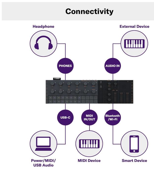 Deluje tudi na (vgrajeno) baterijo, USB podpira tudi MIDI host način (priklop USB kontrolerjev),