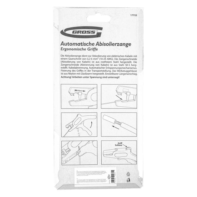 PRO klešče za odstranjevanje izolacije žice 0,2–6mm2Iščete visokokakovostne klešče, ki vam bodo olajšale odstranjevanje izolacije žice? Predstavljamo vam PRO klešče za odstranjevanje izolacije žice 0,2–6mm2 – inovativen in zanesljiv pripomoček, ki bo vaše delo naredil hitrejše, lažje in bolj učinkovito.Te klešče so posebej zasnovane za odstranjevanje izolacije žic z razponom velikosti od 0,2 do 6mm2. Ne glede na to, ali gre za tanke žice ali debelejše kablove, bodo te klešče kos vsaki nalogi. Izdelane so iz visokokakovostnega materiala, ki zagotavlja trpežnost in dolgo življenjsko dobo.Zahvaljujoč svojemu ergonomskemu dizajnu in nedrsečemu ročaju bodo klešče udobne za uporabo in zagotavljale dober oprijem med delom. Njihov natančen rezalni mehanizem omogoča enostavno in natančno odstranjevanje izolacije, ne da bi pri tem poškodovali žico.PRO klešče za odstranjevanje izolacije žice so idealne za električarje, tehnične delavce, hobiste in vse, ki se ukvarjajo z električnimi napeljavami. S temi kleščami boste prihranili čas in trud pri odstranjevanju izolacije, kar vam bo omogočilo, da se osredotočite na druge pomembne naloge.Električne klešče za odstranjevanje žic Gross z rezili iz nerjavečega jekla so zasnovane za električna dela z žico 0,2–6 kvadratnih mm (10–24 AWG). Z njihovo pomočjo je mogoče rezati in čistiti bakrene in aluminijaste kable. Orodje je primerno za domačo in profesionalno uporabo.Vsestranskost – klešče omogočajo prilagajanje dolžine odstranjene izolacije in čistilne sile za delo s kabli različnih velikosti.Trdnost in vzdržljivost – rezila so izdelana iz nerjavečega jekla.Udobno delo brez nevarnosti poškodb – dvokomponentni ročaji so ergonomsko oblikovani, kar zagotavlja udoben in varen oprijem.Nizka teža 170 g – dolgotrajno delo s kleščami ne povzroča nelagodja.
