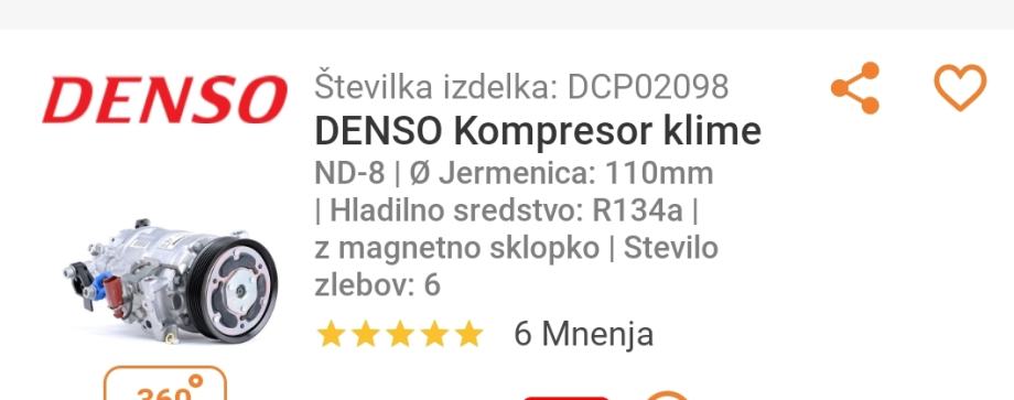 Prodam popolnoma nov kompresor klime Denso. Mišljen je bil za popravilo mojega A4 allroad, vendar se je avto prej prodal. Kompresor je popolnoma nov, zapakiran in neuporabljen. V slikah je opis preostalih modelov Audija, na katere ta kompresor paše.
