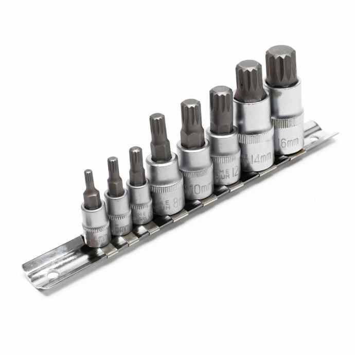 Ponujamo komplet nasadnih ključev XZN. Set je sestavljen iz 8 večzobnih nastavkov v velikostih M4, M5, M6, M8, M10, M12, M14 in M16, vključno z jeklenim držalom, nazobčanim dnom.