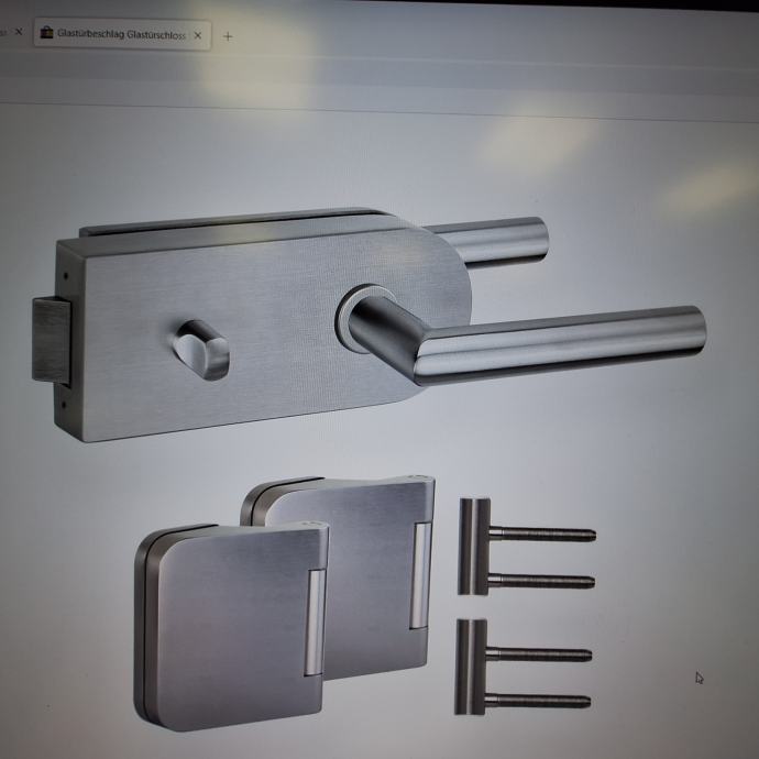 Prodam nove zapakirane inox tečaje, kljuko z možnostjo zaklepanja in prejemali za steklena vratata debeline od 8-12mm in teže do 75kg. Lahko se uporabijo za pisarniška vrata ali wc.