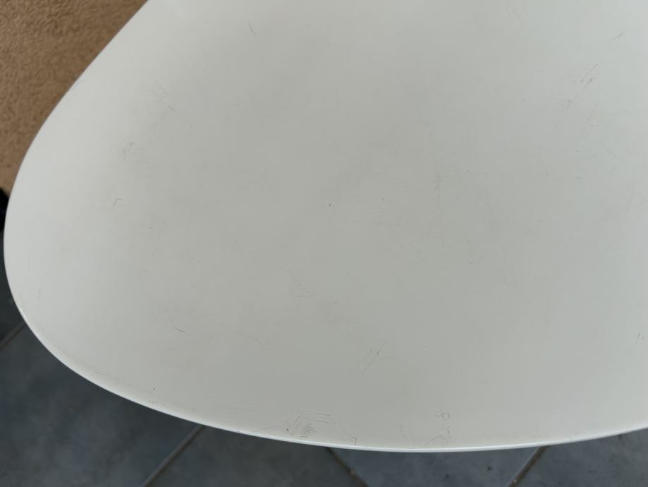 Miza ima le rahle odrgnine, ki so vidne, če se pogleda od blizu in pod kotom (na njej so bili cvetlični lonci in se je površina malo odrgnila, ni pa globokih prask).