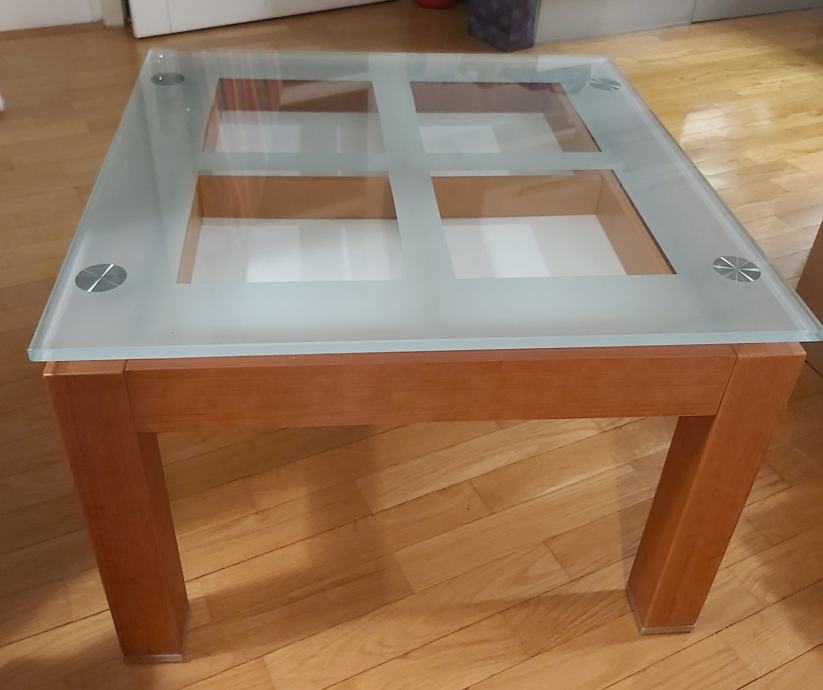 Prodam klubsko mizico - leseno, s stekleno ploščo in 4 delnim dekorativnim predalom. Dimenzije mizice so: površina 60,5 x 60,5 cm in višina 42,5 cm. Prevzem v Ljubljani.