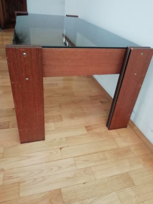 Lesena (verjetno furnirana iverica) miza s stekleno ploščo. Dimenzije: (119 x 61) cm, višina 47 cm. Nekaj manjših površinskih poškodb, steklo nepoškodovano.