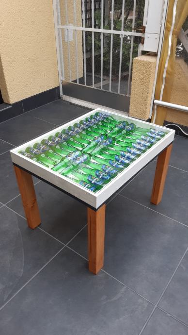 Prodam klubsko mizo HEINEKEN 0.0.Dimenzije 80x61x58 cm(ŠxGxV).Sestavljena je iz praznih steklenic Heineken 0.0,dekorativnih led luči in zgoraj varnostnega stekla.DIY projekt.