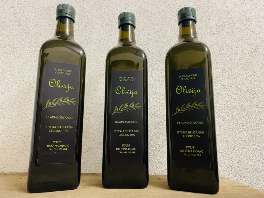 Letošnje hladno stiskano olje iz Istrske belice (90%) in Leccina (10%). 16€/L