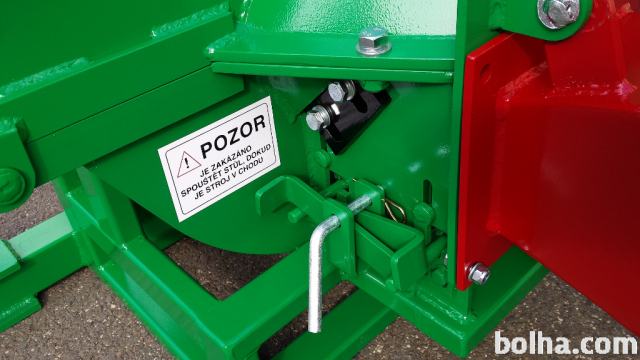 Povezava s tritočkovnim priklopom traktorja v skladu s specifikacijami kupca. Pri drobljenju se veje vstavijo v rdeč lijak za traktorjem, sekanci se odpihnejo na stran- na tla ali v zaboj, v vrečo zbiranja, ki jo je mogoče pritrditi na sekalnik. (dodatna oprema).
