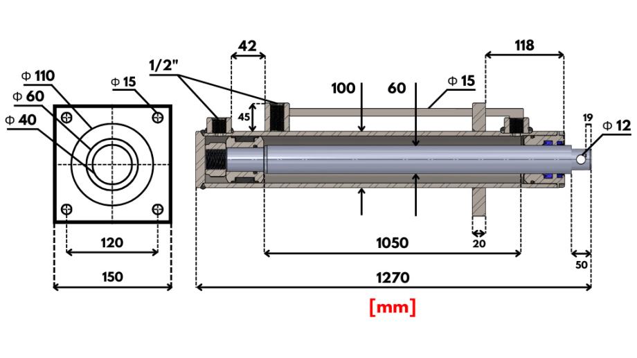 100058 - HIDRAVLIČNI CILINDER Z MONTAŽNO PLOŠČO 100/60-1050 S CEVMI