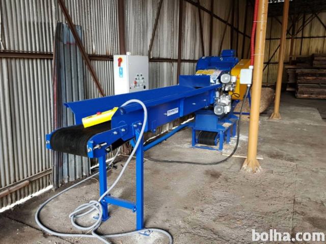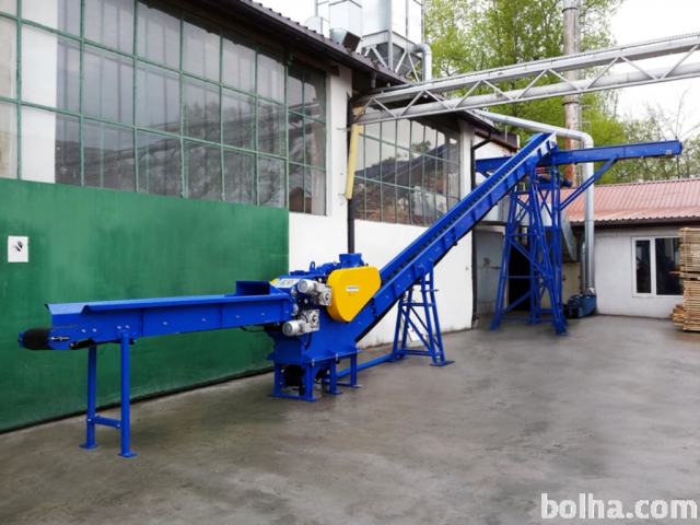 Skorpion 350 EB je stacionarni sekalnik namenjen za drobljenje okroglega lesa, lesa ravnih linij in raznolikih ostankov pohištva do širine 350 mm.Sekalni sistem naprave predstavlja boben z 2, 3 oziroma 4 rezalnimi noži ter eden oporni nož. Konstrukcija namestitve opornega noža (potegne se ga iz ohišja sekalnika) omogoča zelo hiter obrat noža oziroma zamenjavo (nož je naostreni po štirih sekalnih robovih). Noži so izdelani iz orodnega jekla, ki je odporno proti toposti, zaradi česar imajo dolgo življensko dobo. Količina nožev na bobnu ter premer odprtin sita omogoča pridobivanje sekancev z zahtevano velikostjo. Podajanje materiala je transportirano do vhoda z dvema ozobljenima valjema gnanima preko reduktorja.Sekalni stroj je opremljeni z glavnim električnim motorjem z nizko zmoglivostjo. Ta motor v nasprotju z motorji visoke zmogljivosti stabilno deluje in ima večji vrtilni moment. Z uporabo iste moči motorja dosega večji prenos energije ter zaradi večjega premera škripca na glavnem motorju - se podaljša življenska doba klinastih jermenov. Pogon naprave predstavlja električni motor z močjo 37 kW, in opremljen z elektronskim sistemom krmiljenja, ki avtomatsko prepreči preobremenitev tako, da začasno izklopi podajanje.Skorpion 350 EB deluje z jermenskimi in vibracijskimi sistemi za nakladanje in transportiranje materiala. Osnovna oprema drobilca je sestavljena iz drobilca kontrolnega upravljalnega pulta in proti doplačilu nakladalni in dozirni transporter.Naše dolgoletne izkušnje pri zasnovanju strojev za industrijo lesnega sektorja pomenijo, da izvajamo projekte, ki so prilagojene individualnim potrebam strank.Sekanci izdelani z drobilcem Skorpion 350 EB se lahko uporabljajo za kurjenje v pečeh z biomaso ali kot osnovni material za izdelavo papirja ali plošč za izdelavo ploskovnega pohištva, z nadaljno obdelavo v mlinu pa za proizvodnjo peletov ali briketov.