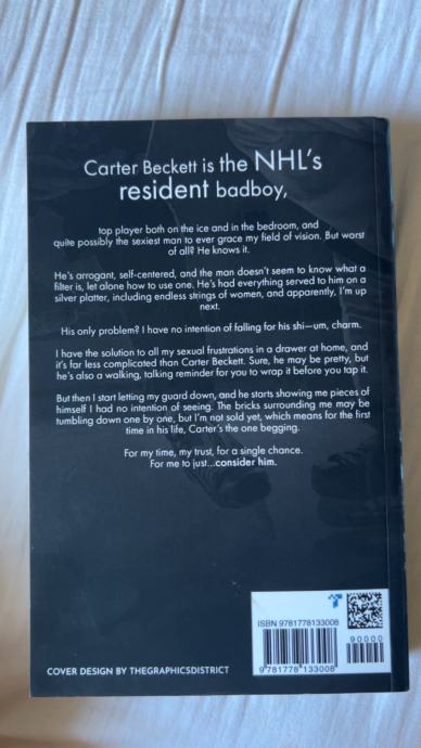 Consider Me je očarljiv hokejski roman o arogantnem igralcu, ki se resno potrudi osvojiti žensko, ki najprej ne želi njegove pozornosti. Polno humorja, iskrive napetosti in romantičnega razvoja. Knjiga je v odličnem stanju.
