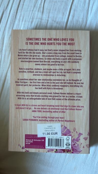 It Ends With Us – Colleen Hoover. Intenzivna in ganljiva romantična zgodba o ljubezni, težkih odločitvah in osebni moči, ko Lily odkrije, kaj si res zasluži v življenju. Roman je bil prebran enkrat in je zelo lepo ohranjen. Knjiga je čista, brez podčrtavanj ali madežev, listi in vezava so v odličnem stanju.