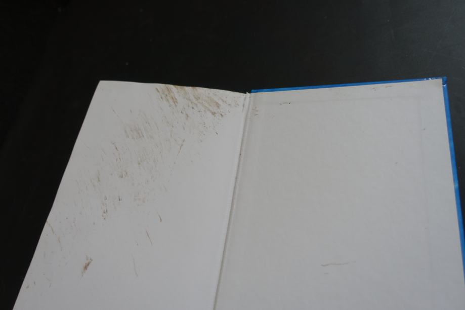 Knjiga ni bila v uporabi, mi je pa padla na tla in ima umazano čisto zadnji del - notranji del platnic in en del lista zadaj.