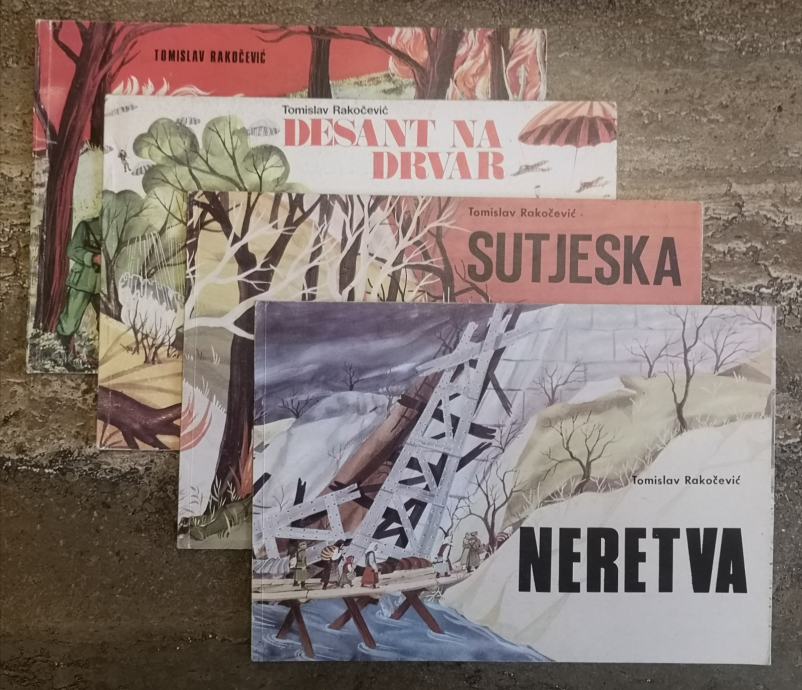 Prodam lepo ohranjen komplet štirih partizanskih knjig avtorja Tomislava Rakočevića in prevajalke v slovenski jezik T. Galbiati Komljanec. Ilustrirane zgodbe o pomembnih bitkah med drugo svetovno vojno. Recenzirane zgodbe. Vintiž, mehke platnice, albumski format, majhne tiskanke. Brez letnice, vendar stare vsaj 40 let. Nepoškodovane, čiste. Prodam samo v kompletu.