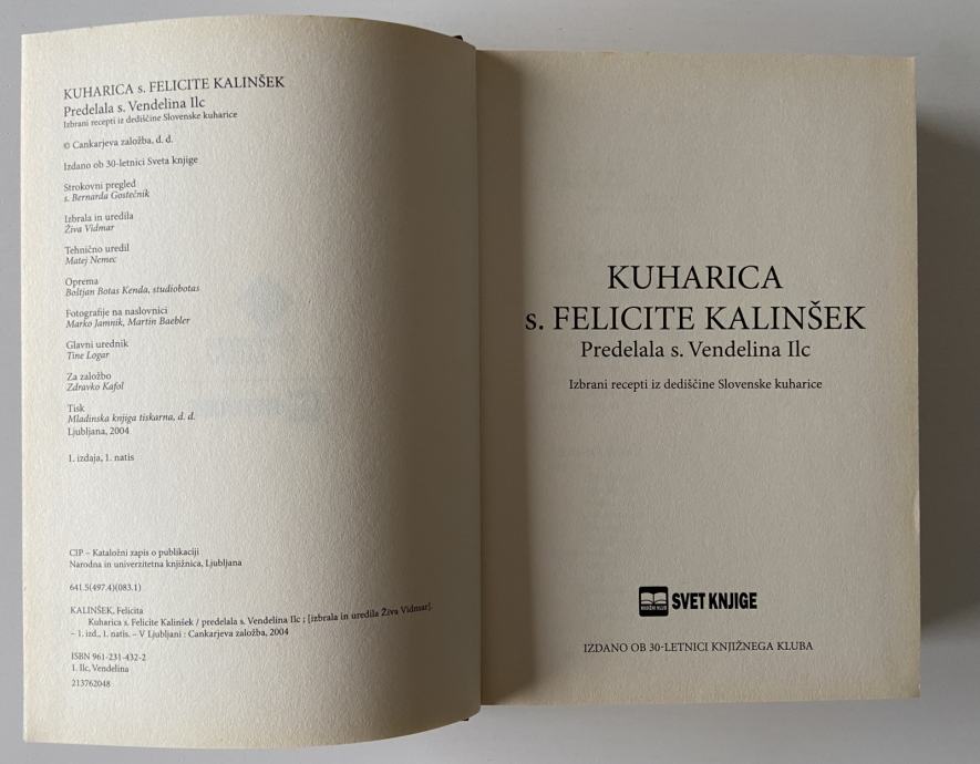 Prodam legendarno slovensko kuharico s. Felicite Kalinšek, predelano in urejeno s strani s. Vendeline Ilc. Gre za izbrane recepte iz dediščine slovenske kuharice, izdano ob 30-letnici Knjižnega kluba Svet knjige.