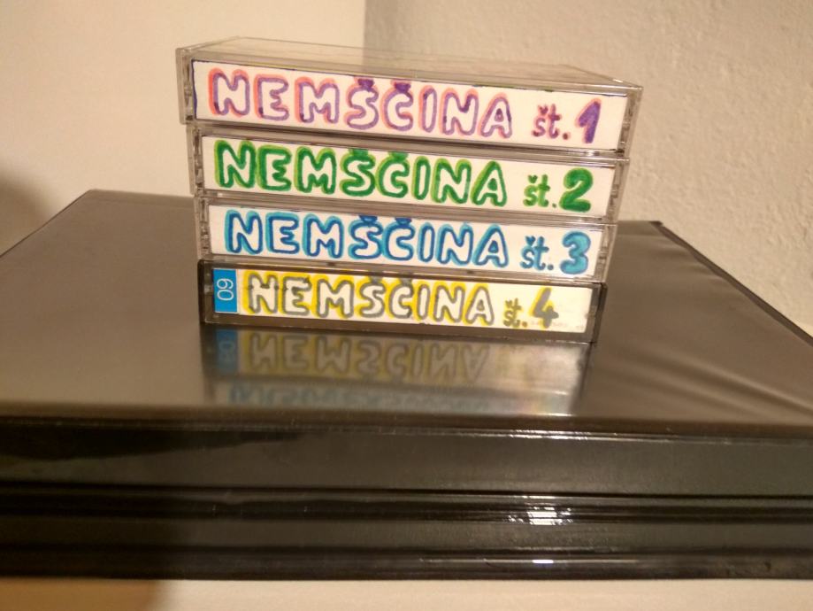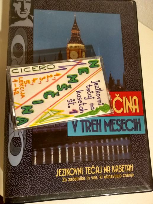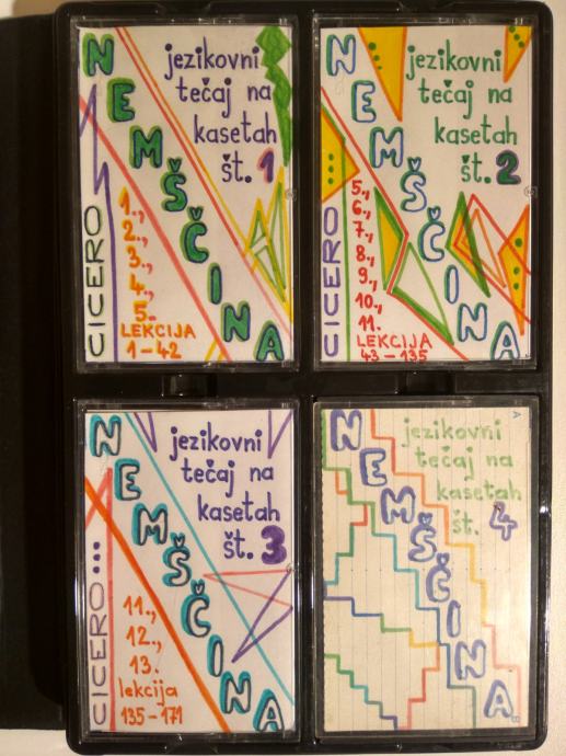 Nemščina v treh mesecih, izobraževalni program CICERO, jezikovni tečaj na štirih kasetah za začetnike in vse, ki obnavljajo znanje (posnetki pogovorov v tujem jeziku in razlago v slovenščini).