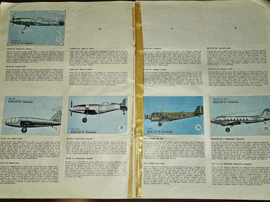 Naprodaj je album s sličicami Avioni Koloy's Kolinska. Ima približno polovico sličic. Ohranjenost srednja. Zraven dam še album o prometu oz. vozilih brez platnic, ki je slabše ohranjen, manjka pa mu zelo malo sličic.
