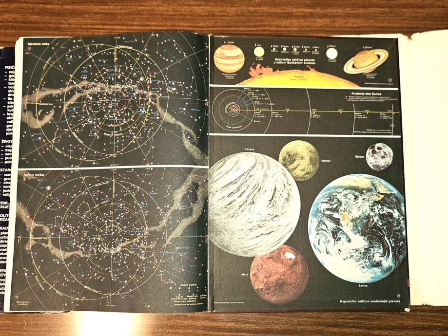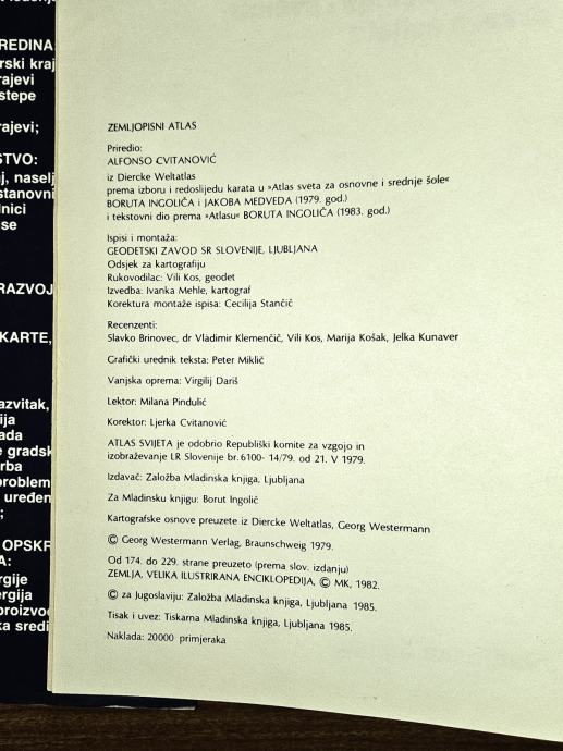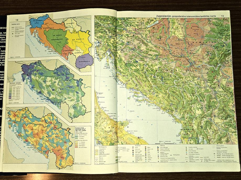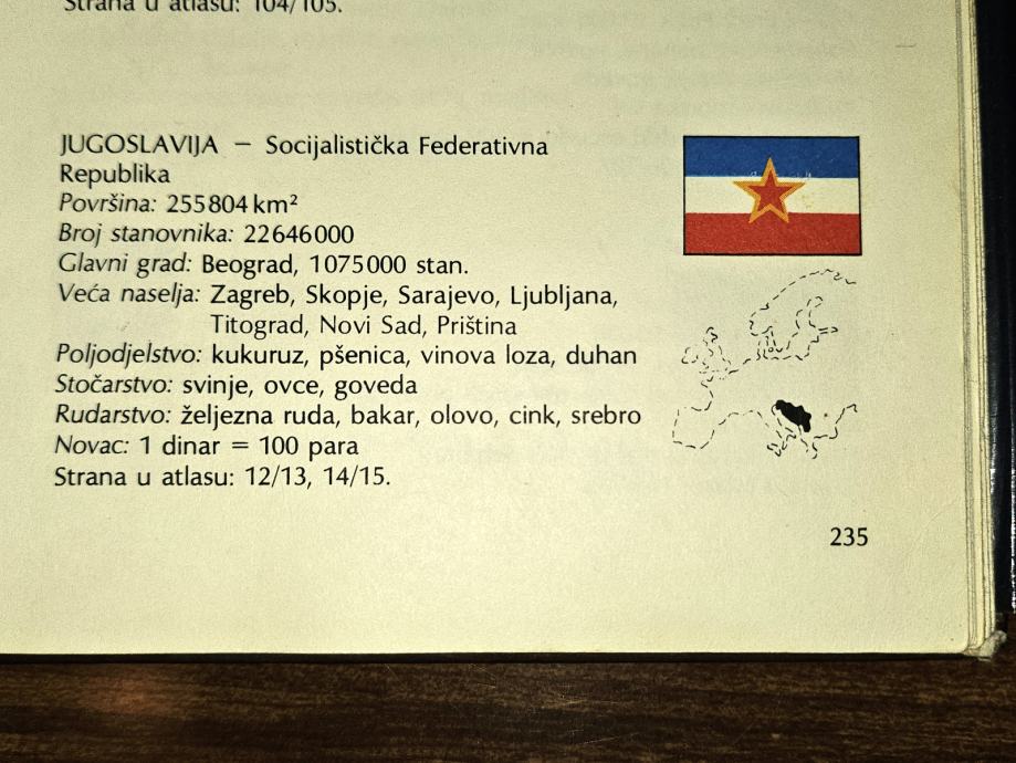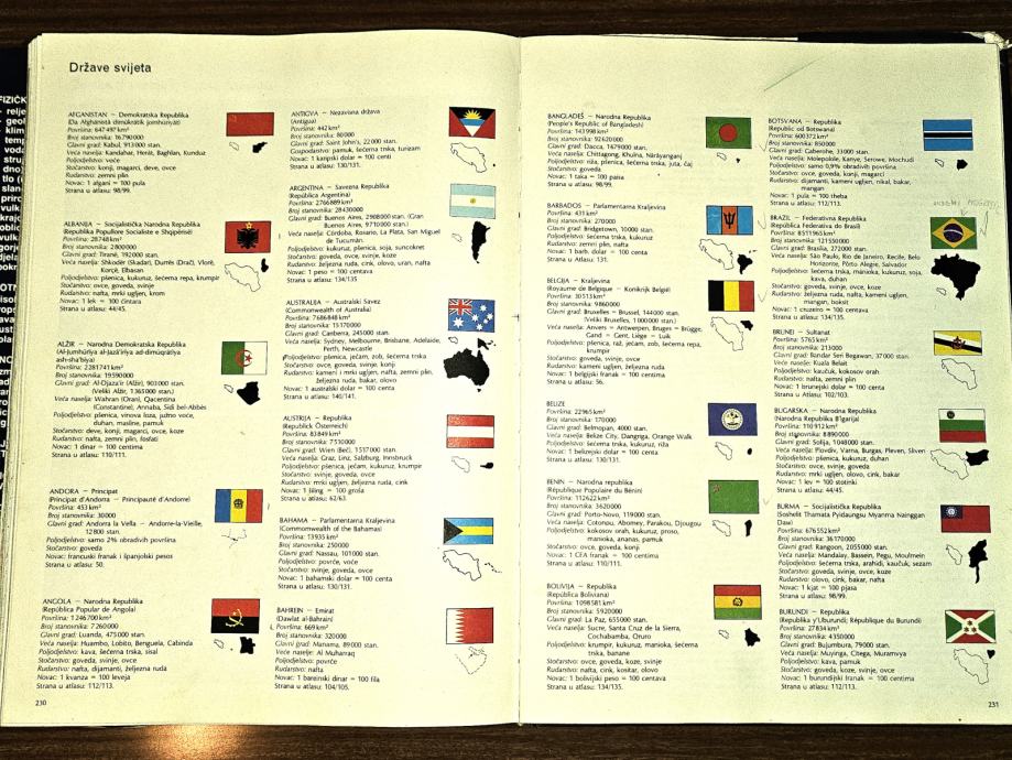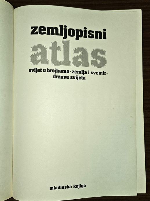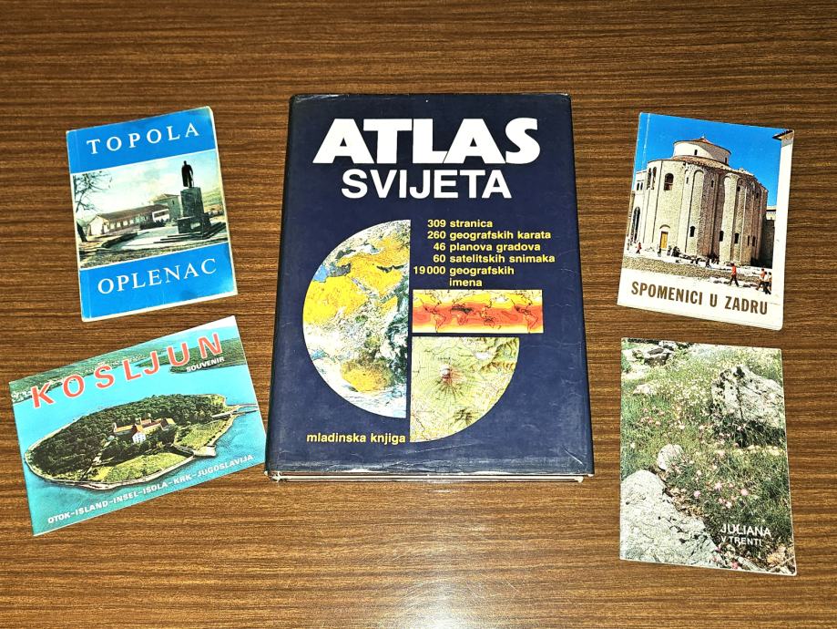 Naprodaj je atlas sveta v hrvaščini iz 80ih. Ima še dodatek besedil o različnih tematikah in seznam takratnih držav z zastavimi ter podatki. Je lepo ohranjen, na ovitku nekaj sledov uporabe. Zraven podarim še nekaj turističnih prospektov iz Jugoslavije.