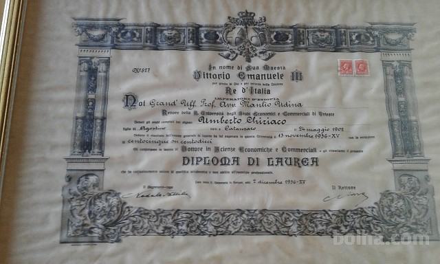 Prodam staro ohranjeno diplomo iz leta 1936 dim.55X38,5 okvirjena.