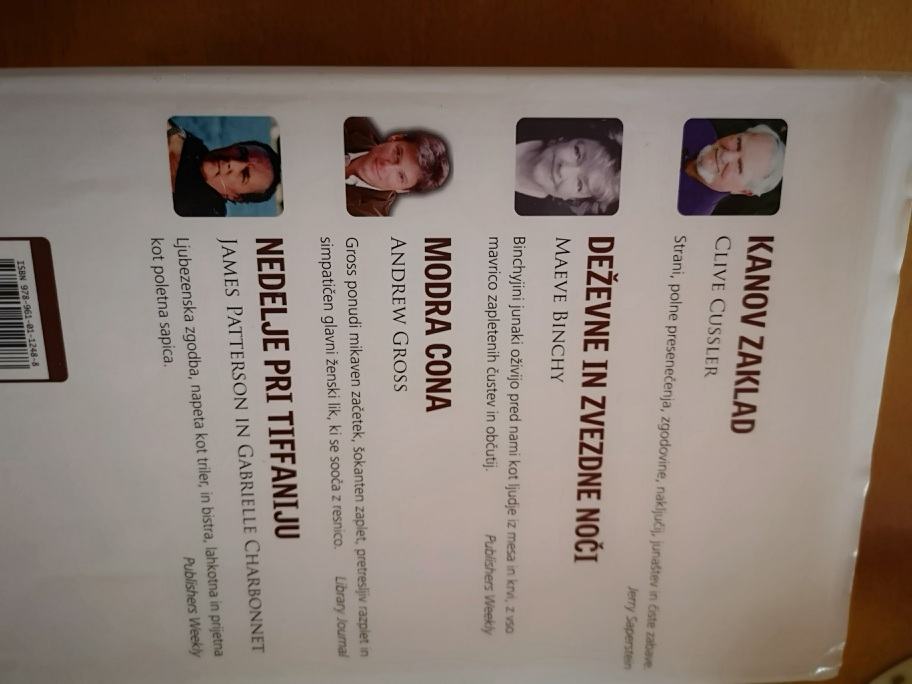 Vsebuje tudi Kanov zaklad = Treasure of Khan / Clive Cussler ; [prevod Marjeta Kožuh]. Deževne in zvezdne noči = Nights of rain and stars / Maeve Binchy ; [prevod Jana Šmagelj. Modra cona = The blue zone / Andrew Gross ; [prevod Mojca Vodušek]. Nedelje pri Tiffaniju = Sundays at Tiffanys / James Patterson in Gabrielle Charbonnet ; [prevod Irena Furlan]