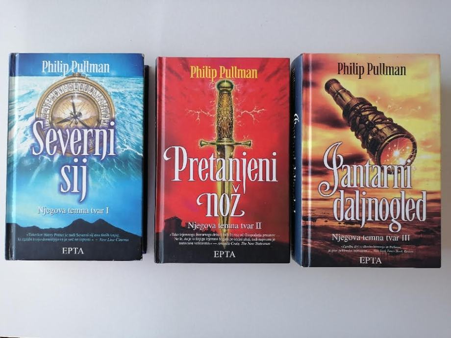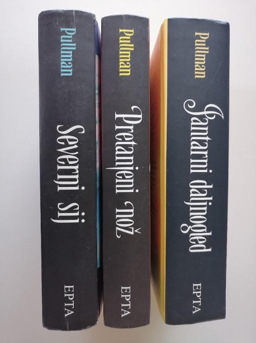 Knjige NJEGOVA TEMNA STVAR, 3 KNJIGE, SEVERNI SIJ, PRETANJENI NOŽ, JANTARNI DALJNOGLED, EPTA, trde platnice, dobro ohranjene, v kompletu vse 3 knjige za 150 eur.
