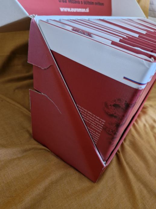 Rahlo poškodovan karton škatle, ki vsebuje knjige.