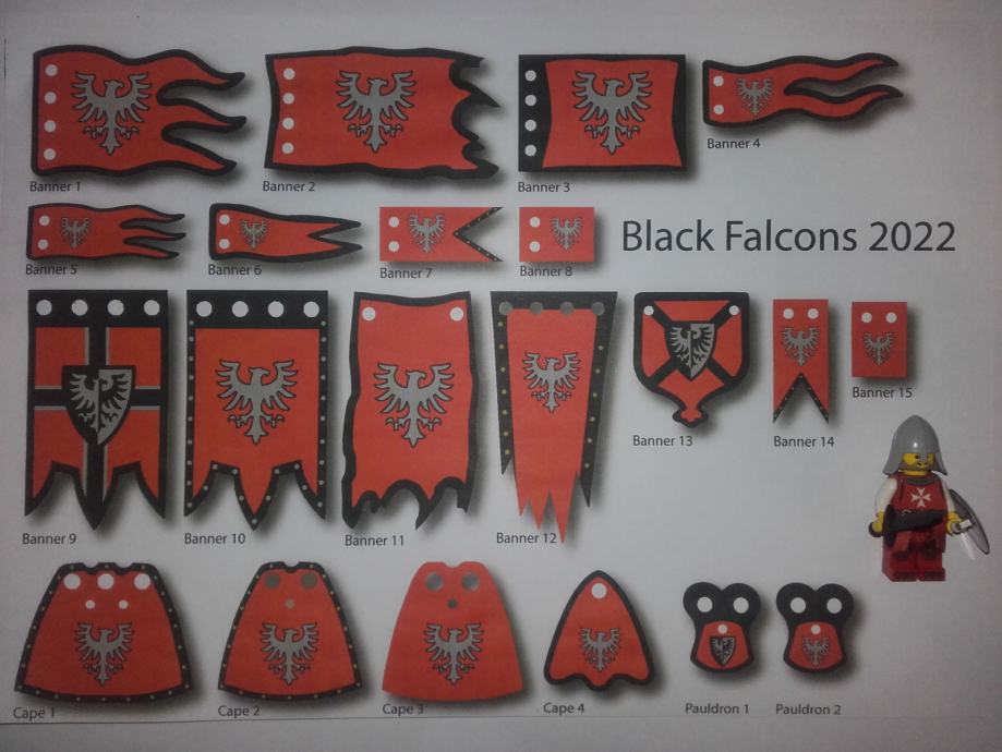 Iz lastne zbirke je na voljo kompatibilna obojestranska zastavica (banner) iz platna 4€ ali pa enostranski plač (cape/pauldron) 2€ ter torso obleka (Armor, Kama Cloth) 2€, primereni za lego set Castle, Kingdoms, Vitezi, Grad, Black Falcons in lego minifigure.