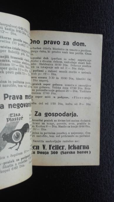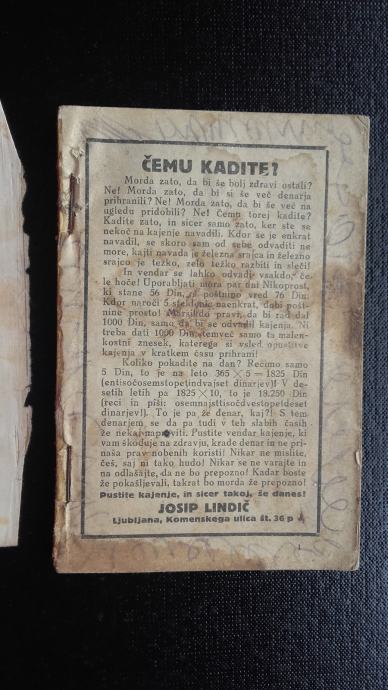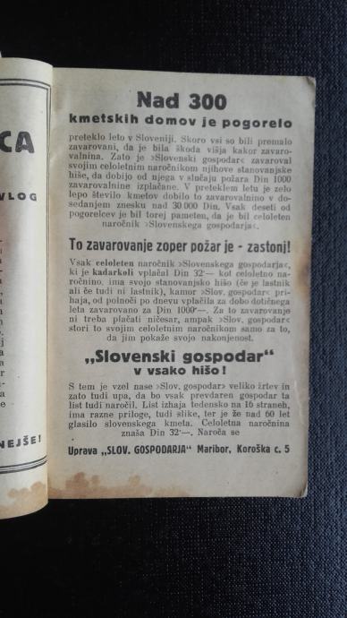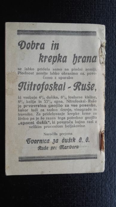 Slabše ohranjena,strani niso oštevilčene.Manjka zadnja platnica,mogoče na koncu kakšen list z reklamami-slikal sem zadnjo reklamo(Ruše).
