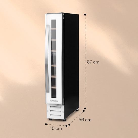 Razkošno hlajen: vgradni vinski hladilnik Klarstein Vinovilla 7 Uno je tanek , praktičen vgradni hladilnik, ki skozi sodobna steklena vrata in belo notranjo osvetlitev spretno predstavlja zaloge dobrega vina . Poleg tega je vaš vinski zalog dolgoročno optimalno shranjen in enakomerno ohlajen z vseh strani – ker so steklenice le ob strani lesenih polic. Tako lahko uživate v neponarejeni cvetici najboljših vin!
