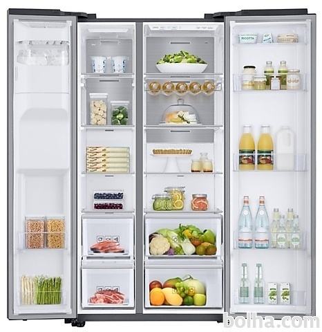 Opis:SAMSUNG RS 68N8240S9/EF side by side hladilnik, neto prostornina zamrzovalnika: 210 l, neto prostornina hladilnika: 407 l, razred energijske učinkovitosti: A+Velika prostornina - SpaceMax Technology™Samsung RS8000 hladilnik ponuja več prostora za shranjevanje, saj SpaceMax Technology™ omogoča dodatno notranjo kapaciteto brez sprememb zunanjih dimenzij (100 l več kot običajni modeli).Svežina z vlago - Twin Cooling Plus™Poskrbi, da ostane hrana do dvakrat bolj vlažna in sveža. Twin Cooling Plus™ tehnologija optimizira temperaturo in vlažnost v hladilniku in zamrzovalniku z neodvisnim hlajenjem. Bolje ohranja hrano in ščiti njen okus tako, da preprečuje mešanje vonjav.Popolna svežina - Natančno hlajenje kuharskih mojstrovOhranite svežino, okus in teksturo hrane dlje časa. Neodvisno hlajenje vsakega razdelka, da bodo vsi kotički enakomerno ohlajeni. Napredna izolacija zmanjša nihanja temperature, ne glede na to, kako toplo ali mrzlo je zunanje okolje. Tehnologija z digitalnim inverterjem natančno zaznava in krmili temperaturo.Elegantna in neprekinjena oblika - Ploska vrata in vgreznjena držalaDodajte v svoj dom elegantno in neprekinjeno obliko v skladu s trenutnimi trendi preprostih in čistih oblik. Ima zelo lepa ploska vrata in vgreznjena držala. Tako ne štrlijo ven in ne motijo linij.Preprost in gladek avtomat in zaslon - Minimalen avtomat in skrit zaslonUživajte v preprostem načinu hlajenja. Minimalni avtomat in skriti zaslon dopolnjujeta minimalistično oblikovanje sprednje strani. Avtomat je vgrajen neposredno v vrata, da sta hladna voda in led na dosegu roke. Ostali kontrolniki so diskretno skriti v notranjosti, a hkrati preprosto dostopni.Lastnosti: Preprečevanje nabiranja ledu (No Frost) Več zračnih tokov (Multi Flow) Vrsta hlajenja: Twin Cooling Plus Alarm za odprta vrata Hladilno sredstvo: R-600a Ciklopentanska izolacija Hladilni pokrov: Kovinski hladilni kanal Kompresor z digitalnim inverterjem Vrsta zaslona: Notranji (Ice Blue) Ročaj vrat: Vgreznjeni Počitniški način Vrsta avtomata: Ledomat in vodomat (napeljava) Barva: InoxHladilni del: Število polic: 4 Pregrada za mlečne izdelke Stojalo za vino Število odprtih vratnih predalov: 5 Notranja LED lučka Material polic: Kaljeno steklo Število predalov za zelenjavo in sadje: 2Zamrzovalni del: Število polic: 4 Število odprtih vratnih predalov: 2 Avtomat za led Notranja LED lučka Število predalov: 2Tehnični podatki: Neto prostornina: 617 l Neto prostornina zamrzovalnika: 210 l Neto prostornina hladilnika: 407 l Razred energijske učinkovitosti: A+ Raven hrupa: 39 dBA Klimatski razred: SN,N,ST,T Zmogljivost hlajenja (kg/24h): 12 kg/24hr Avtonomno delovanje (naraščanje temperature): 10 h Poraba energije: 450 kWh/letoDimenzije in teža: Neto širina: 912 mm Neto višina ohišja s tečajem: 1780 mm Neto globina z ročajem vrat: 716 mm Neto globina brez ročaja vrat: 716 mm Neto globina brez vrat: 610 mm Neto teža: 118 kg Več podatkov si oglejte na tej povezavi...